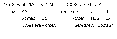 To conclude about Xavánte and Xerénte, it is likely that the Xavánte õ di and Xerénte kõdi negators have an existential origin, i.e., that they arose with a NEC. This conclusion, however, is not quite final yet. The analysis in the next section will give us a reason to return to at least Xerénte and bring in a privative hypothesis nevertheless, not as a replacement of the existential hypothesis, but as an addition.