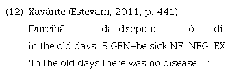 Xerénte di thus has a variety of related but slightly different uses, viz. of a predicative, stativizing and existential nature. Its negative uses fit here too: Sousa Filho (2007, p. 140) calls it ‘predicative’, while Miranda (2015, p. 265) and Cotrim (2016, pp. 119-120) use ‘stative’, and we don’t see any objection to calling this use ‘existential’.