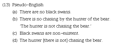Claiming a link between standard and existential negation urges one to bring in the notion of the ‘Negative Existential Cycle’ (‘NEC’). There are a few different approaches in the literature (see Croft, 1991; Veselinova, 2013, 2014; Veselinova & Hamari, 2021; van der Auwera et al., 2021). The basic idea is that first a dedicated expression for the negation of the existence of an object is also used for standard negation, viz. by expressing the negation of the existence of a state of affairs, and that these two uses later split (and thus prepare the ground for this kind of change to happen again). (13) and (14) illustrate this with pseudo-English. ‘There is/are no’ is used for denying the existence of an object - (13a) and (13b) shows that in pseudo-English ‘The hunter is not chasing the bear’ is expressed as a denial of the existence of a state of affairs of the hunter chasing the bear. This may be preceded by a stage in which pseudo-English was just like English and expressed ‘The hunter is not chasing the bear’ as, to wit, ‘The hunter is not chasing the bear’. It is this version of the NEC that is schematized in (14) and we see that ‘there is no’ takes over from ‘not’ for the expression of standard negation. What happens then is that pseudo-English makes another exponent for the existential negation of an object, e.g. ‘is non-existent’ – (13c). In addition, pseudo-English may drop the semantic existential component in the expression of standard negation relative to a state of affairs – (13d). In the latter case the form may still reflect the existential original – we represent the new standard negator deriving from an earlier existential negator as ‘[there.is.no]’.
