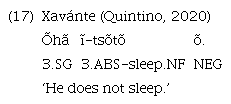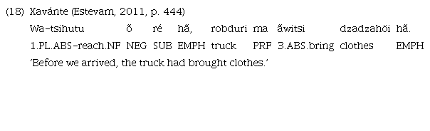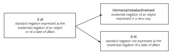 In Xerénte and the Culuene dialect of Xavánte standard negation is construed as the non-existence of a state of affairs. In the São Marcos dialect of Xavánte, however, the marker is hardly used for negative existence, and the latter is expressed with something else. In this dialect õ di still has stative, predicative uses, but no longer the subtype used for existence. (16) is a sketch of the NEC for the São Marcos dialect of Xavánte.