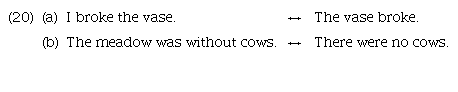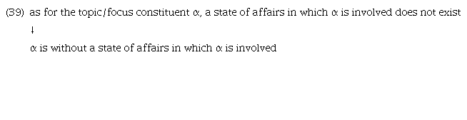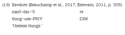 But we are doubtful. First, it is not because (19) can be paraphrased with ‘without’ giving ‘things without use’, that one can conclude that õ is a privative morpheme. ‘Not use things’, ‘non-existent-use things’ would do as well, and in fact the gloss in Beauchamp et al. (2017), following Estevam (2011, p. 305), is simply ‘neg’. Of course, the notions of privative and existential negation are closely related: when somebody/something is without somebody/something, then the latter somebody/something does not exist with respect to the first one. So it is no surprise that in Veselinova (2013) 95 language-sample the existential and privative negators are identical in ten languages. In those cases, one could think of the negators as a kind of labile operator, for the entity that does not exist is also the entity that the states of affairs is deprived of (‘is without’).
