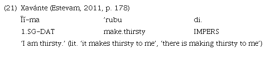 So we do not exclude that the Xavante õ was a labile existential-privative operator. Second, ‘be without’ forms a positive predication, which ascribes a negative property, and it is also a stative predicate. So one would expect the positive stative predicate ‘be without’ to be expressed the same way as, for example, ‘be thirsty’. In Xavánte ‘be thirsty’ is indeed taken as stative predicate – and, as one might expect, not as an adjective, for the language does not have adjectives – and this is expressed impersonally.