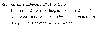 The first thing to note is that the use in (22) is not predicative but copredicative. It forms a secondary predication, subordinate to a main predicate. In (22) the main predication says that they will suffer more and the secondary one says that this will happen without water. All the examples in Estevam (2011) are copredicative. We could also note that the privative marker is not õ, but ãna. This is interesting, but it does not damage the privative analysis of õ. The latter could simply be the old privative, kept in lexemes and in the standard negator, and which was replaced in the copredicative use.