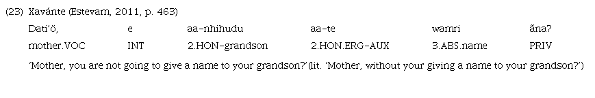 Let us, finally, briefly return to Xerénte. The Xerénte standard negator is kõdi, and we offer the same analysis as for Xavánte. What furthermore pleads for the NEC is that di still has an existential use, illustrated in (7). There seem to be two privative markers. One is knã, which, a reviewer points out, must be cognate to Xavánte ãna, illustrated in (23), with both Xavánte ãna and Xerénte knã as regular reflexes of *kə̃nə̃4.