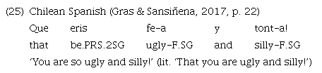 What (23) shows, we propose, is that when the main predication is clear from the context, as when it has just been mentioned, the secondary predication can have the effect of a main predication. The process resembles insubordination, i.e., the conventionalized main predication use of a subordinate predicate. This is a cross-linguistically widely distributed phenomenon (Evans & Watanabe, 2016), illustrated in (25) and (26) with Chilean Spanish and English.