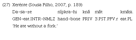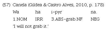 The starting point is again, we propose, like for kêt, the integration of a topic/focus constituent integrating into the clause and then turning the existential into a privative, from ‘as far as you are concerned, there is no grabbing it’ to ‘you are without grabbing it’. We also see that the ‘privativization’ applies to pronouns, like it does for Apinajé, but not for Kĩsêdjê (see section on Goyaz *kêt). So to this extent at least Canela does have a privative use of nare and in this respect nare is like kêt. There is no such evidence for pjo. Panará alignment is altogether different, with a generalized ergative-absolutive system.