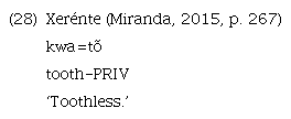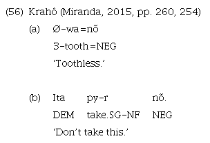 It is clear, however, that tũ is an old form. The form that Nikulin (2020, pp. 430, 454) gives for Proto-Jê is also the origin of the tõ negator found in various functions in the Goyaz languages Xavánte, Xerénte and possibly11 Panará. For Panará, Nikulin (2020, p. 454) also claims that the reflection of the protoform would be rõ, and this is used for the privative (Dourado, 2001, p. 118). There are also cognates in the wider Macro-Jê family, both in the Trans-São Francisco and Jabutian groups (Nikulin, 2020, pp. 118, 387).