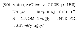 Another complex form is Kajkwakhrattxi kêrê-re, with an originally emphatic -re element, glossed as ‘diminutive’ by Camargo (2015).