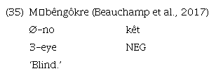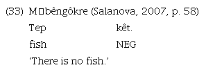 In Mẽbêngôkre kêt also has a privative use – illustrated in (35), cf. also Trevisan & Pezzotti (1991, p. 43), whose lemma for kêt has ‘not, without, be nothing, be extinct’. It is reported as one of at least two privative markers in Krahô, the other one being =nõ5, but in this language kêt is used for neither standard nor existential negation.