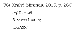 A final remark: õ and kõ must be very old. Nikulin (2020, p. 130) reconstructs them to a Proto-Jê neg form, because of the possible Karajá cognate -kõ (Ribeiro, 2012, p. 63).