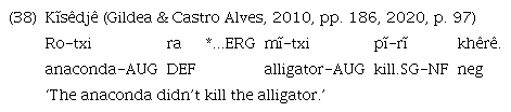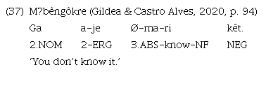 This other factor is a process through which an extra-clausal left periphery topic (or focus) gets integrated into the clause and becomes its subject – described in the context of the ‘nominative-absolutive alignment’ hypothesis put forward by Castro Alves (2010), followed by Gildea and Castro Alves (2010, 2020). It is a process hypothesized for a variety of grammatical operators, not just negators. Extra-clausal left-periphery topic structures are considered a property of all the Goyaz languages. When the topic is a pronoun, it usually takes nominative marking and when it is a noun, it is unmarked. The front position constituent is coreferential with another constituent in the clause, whatever case marking this coreferential constituent has there. In (37) we first get the nominative pronoun ga, which is coreferential with a-je, which is ergative. The reason why the pronoun a-je is ergative is that subordinate clauses, including the non-finite constructions that go with the negator, have ergative-absolutive alignment. This topic then becomes integrated into the clause, it becomes its subject, and since there is also the coreferential subject argument of the erstwhile subordinate clause, we can speak of ‘subject doubling’ (cf. Salanova, 2007, pp. 34-35)6.