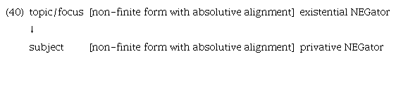There are two exponents for the third person actor, a nominative and an ergative one. To the extent that the nominative one is integrated in the clause, a privative reanalysis of the existential negator seems possible.