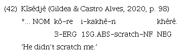 The reanalysis of the topic as a subject like the reanalysis of the negator is a gradual process. We have seen that in Kĩsêdjê the ban on the ergative inside the subordinate structure and the reanalysis of the negator only works with nouns (see (38)). It does not work with pronouns. The latter do not normally (cf. Gildea & Castro Alves, 2010, pp. 188-189) allow the topic construction, and there is no reason to deny that standard negator in (42) is anything other than an existential negator.