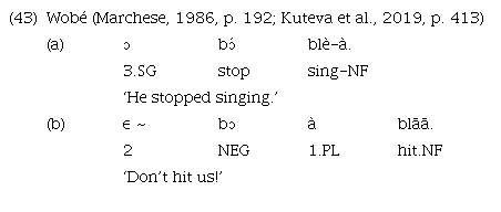 There are indications in the Jê languages that standard negators can come from verbs meaning ‘finish’. This relates to an interesting issue in the typological literature. Givón (1973, p. 917, 1978, p. 89, 1984, p. 232) claims that negative verbs can lead directly to what we now call ‘standard negators’ (cf. also Heine, 1993, p. 34). The idea is intuitive, but, as pointed out in van der Auwera (2010, p. 75), there is little data to show this. Ten years further, there is still little evidence. Heine and Kuteva (2002, pp. 283-284) do document a change from ‘stop’ into negation, but only for prohibitives. This is true for Kuteva et al. (2019, pp. 412-414) too: they list 10 languages in which ‘stop’ became a negator and in each case the negator is prohibitive. (43) is an example from a Kru language.