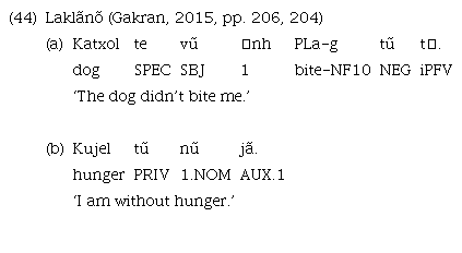An indication that a standard negator can develop from a verb meaning ‘finish’ comes from Jolkesky (2010, pp. 215, 244), who reconstructs *tũ(-ɡ) for Proto-Paraná Jê, both for a standard negator and for a lexical verb meaning ‘complete, not have anymore, finish (something)’. Jolkesky (2010), however, does not connect the two etymologies. Nikulin (2020, p. 430) discusses only the etymology of the negative morpheme, he reconstructs it to Proto-Jê *tũK with ‘negation’ as the meaning, he does not discuss the ‘finish’ verb, but he thought that it was obvious that the ‘finish’ and negative meanings are related (A. Nikulin, personal communication). Neither Jolkesky (2010) nor Nikulin (2020) express any view on whether the *tũ(-ɡ) form could express existential negation. When we look at the present Paraná forms deriving from the Proto-Paraná Jê *tũ(-ɡ), nobody has suggested a link either between verbs of ‘finishing’ and standard negation or between ‘finishing’ and existential negation. Nevertheless, the identity is clear in at least present-day Kaingáng, as described by Wiesemann (2011, p. 89). As to a link between existential and standard negation, Miranda (2015, p. 272) lists tũ for both Kaingáng standard and existential negation, but this is maybe only based on a dictionary lemma including ‘inexistente’ in the lemma for tũ (Wiesemann, 2011, p. 89). M. S. Silva (2011, pp. 156-157, 173) has examples. The meaning sem ‘without’ is in the Wiesemann (1972, 2011) lemma too, so perhaps there is a standard – privative polyfunctionality as well (cf. also Gonçalves, 2007, p. 192). This polyfunctionality is definitely also found in Laklãnõ (Gakran, 2015, pp. 204, 206), as illustrated in (44)9.