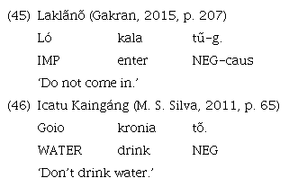 As mentioned in the introduction to this section, the general typology prepares us to see an especially close link between a ‘stop’ verb and prohibitive negation. There is no evidence for *tũK ‘finish’ to have a special affinity with the prohibitive. Thus Laklãnõ uses a *tũK form for both standard and prohibitive negation (Gakran, 2015, pp. 203-208), and Kaingáng uses the *tũK form only for standard negation. Compare (44a) with (45) for Laklãnõ and (3) with (46) for Icatu Kaingáng.