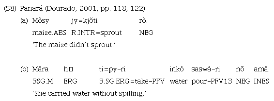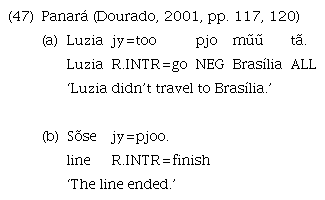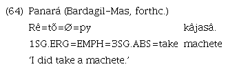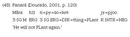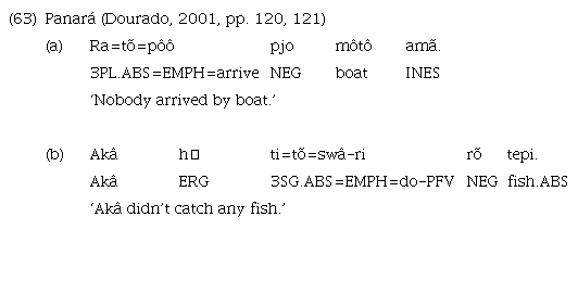 Finally, it has been suggested that Panará has a circumverbal pattern with tõ in preverbal position and pjo or, less commonly, rõ in postverbal position (Dourado, 2001, p. 120). (63) are Dourado (2001) examples, but the glossing of tõ is ours.