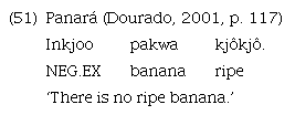 In (50) we see a negative verb feeding into the NEC. It is not to be denied that this is possible. But what we see in Panará is different: in Panará the verb skips the second stage of (50) and for objects the existential negator is different, viz. inkjoo, shown in (51).