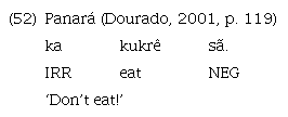 Panará does not use pjo as a privative negator either. Here rõ is used. We will come back to rõ at the end of the next section. Pjo is also not used for prohibitive negation, as becomes obvious from (52).