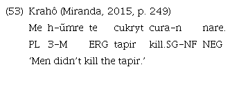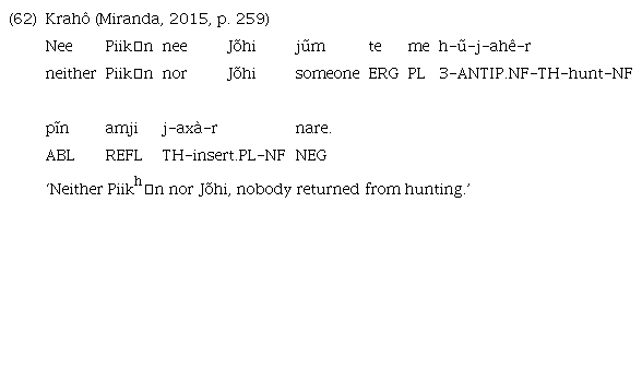 Like for Panará we should ask how the Timbíra ‘finish’ verb acquired a standard negation sense. Castro Alves (2010, p. 468), followed by Gildea and Castro Alves (2020, pp. 87-88), explicitly says that the change involved an intermediate existential negation sense. This claim does not say what kind of existential negator it is. Like for Panará pjo we are not aware of any evidence that nare became an existential operator for objects. Of course, we don’t know about the earlier stages, but at least in present-day Krahô we find a negative verb jamrẽare as an existential negator (55).