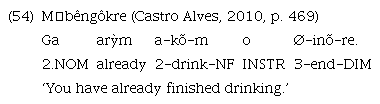 In awareness of the grammaticalization literature deriving standard negation from negative verbs, Castro Alves (2010, pp. 468-469) claims that the Timbíra standard negator nare (from *inõare, A. Nikulin, personal communication, 2020) is a grammaticalized form of ‘finish’12. A standard negation example is shown in (53). (54) illustrates a full verb use in closely related Mẽbêngôkre (cf. also Costa, 2015, pp. 189-192).