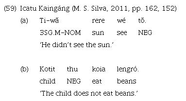 Even though the Jê standard negators are mostly postverbal, there are some exceptions. The first two take us to Kaingáng. First, the dialect of the village Icatu (São Paulo) allows a preverbal pattern, which uses what looks like an allomorph of the postverbal negator tõ.