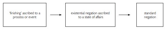 If Dourado (2001) is right and the meaning of the pjo verb in (48) has bleached, one can say that it expresses non-existence: when a process or event is finished, it does not exist anymore. The discontinuation sense is still present in (48) but perhaps the verb can also be used to refer to the non-existence of a state of affairs, independently of whether a process or event is finished or has not even started. If that is possible, then the verb has widened its sense: from non-existence due to finishing to non-existence tout court. This scenario is schematized in (49).