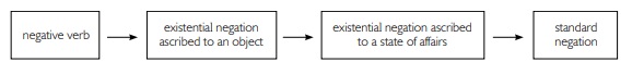This notion of existential negation is, of course, a key ingredient in the NEC, but it plays a different role there. In the NEC a negative existence sense applies to both objects and states of affairs. The NEC has a stage in which existence is denied to a state of affairs in the same way as it is denied to an object. There is no such stage in (49). What we see therefore in Panará is a scenario that is similar to the NEC, but it is crucially different. This scenario is also different from what van Gelderen (2021, p. 545) sketched in (50).