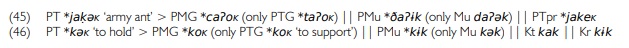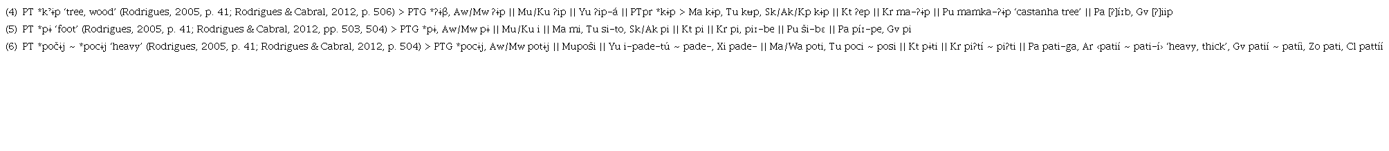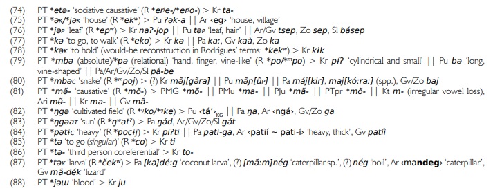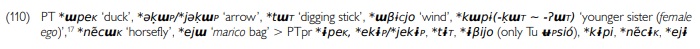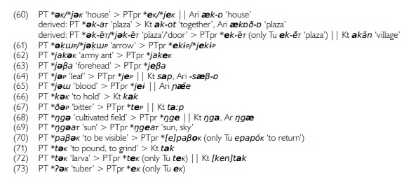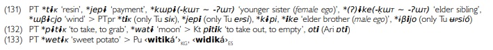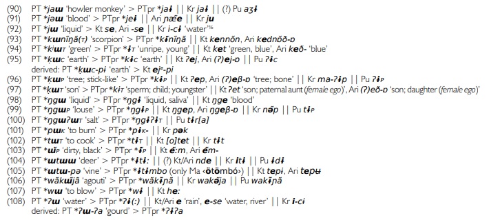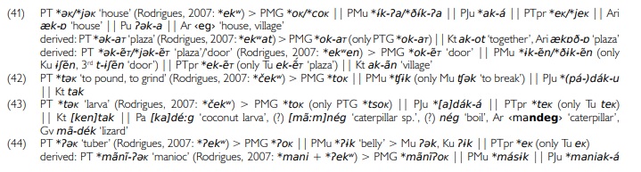 To the best of our knowledge, no PT reconstructions for the following cognate sets are proposed in the works by Rodrigues (2007). He would probably reconstruct *tˀakˀekʷ ‘army ant’ and *kekʷ ‘to hold’.