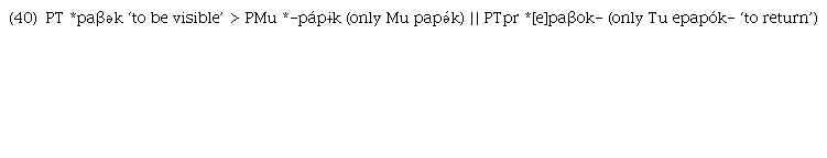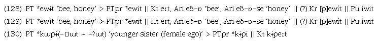 To these one may add the verbs Tu [e]pik-, Kt (a-)mbik and possibly Pu [t]api-a ‘to sit’, if these are related to PT *apɨk ‘to sit’.