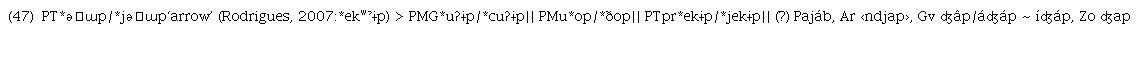 Rodrigues (2007, p. 186) states explicitly that *kʷˀ is reflected in the daughter languages precisely in the same way as *kˀ (we prefer to symbolize the segment in question with the ad hoc character *ḳ), and the labialization in the etymology for ‘arrow’ is reconstructed only in order to account for the correspondence between a front vowel in the Tuparian languages and rounded vowels in the ‘Eastern’ Tupian languages. Also note that the PT stem for ‘arrow’ almost certainly contains the formative for tree- or stick-like objects *-ḳɯp (*-kˀɨp in Rodrigues’, 2007 reconstruction), with reflexes in all Tupian languages, none of which shows any trace of labialization. In this sense, our proposal is superior to Rodrigues’ (2007) in that no need arises to reconstruct an extra consonant found in only one stem.