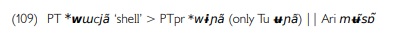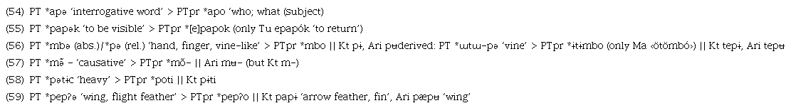 In the following examples the apparent mismatch between the reflexes in Tuparian and Arikém is explained by vowel fusion: PT *ewɨ > *æhi > Kt eː (instead of *ai), Ari e (instead of *æi); PT *ɨ(p)ḳɯ or *ɨ(p)ʔɯ > *iʔe > Kt eː (instead of *ie).