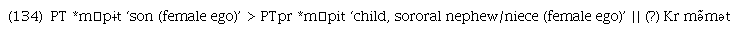 There are also two PT etyma which have reflexes in Karitiana, but not in other languages which distinguish between *ɯ and *ɨ: PT *mbVʔɯt ~ *mbVḳɯt ‘necklace’,18*tɨʔɯt ~ *tɨḳɯt ‘maternal aunt’ > Kt mboʔet ~ mõet, teʔet. Based on the Karitiana evidence, we reconstruct PT *ɯ (we assume that the latter stem is derived from PT *tɨ ‘mother’ and thus reconstruct *ɨ in the first syllable, translaryngeal assimilation of vowels is not unheard of in Karitiana; alternatively, the Karitiana word could be related to Ari ‹utaíră›N ‘id.’).