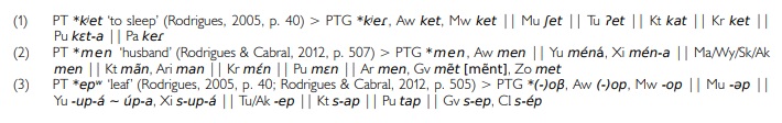Under closer scrutiny, however, it appears that the available evidence does not support either the identification of the correspondence (b) as a context-dependent offshoot of (a) or the reconstruction of a labialized stop series for Proto-Tupian. Although we concur with Rodrigues (2005) in reconstructing PT *e for the correspondence (a), we disagree with his diachronic interpretation of the remaining three correspondences in that: