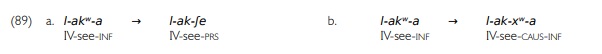 Aside from general considerations stemming from principles of acoustics and perceptual phonetics, it is not hard to find cross-linguistic evidence supporting the contention that such secondary articulations found in stop consonants behave phonologically as if ‘looking for’ a supporting vowel. Thus, in Khwarshi, an Eastern Caucasian language, labialization is found as a secondary articulation feature, mostly in velar and uvular consonants (Khalilova, 2009, pp. 17-18). The contrast is restricted basically to word-initial and word-medial position preceding a vowel, as in etʷa ‘fly’ vs. eta ‘touch’, lakʷa ‘see’ vs. laka ‘lick’. The dynamic phonology of the language also demonstrates a preference for such labialized release consonants to occur preceding a vowel. Labialization is either lost (89a) or transferred to another consonant, one that precedes a vowel (89b), whenever a -C(V) suffix is added to a root containing a final labialized stop.