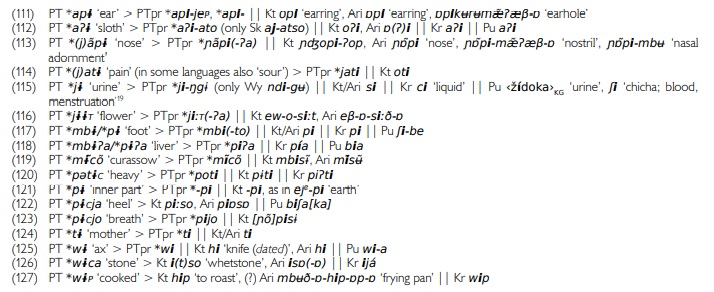 PT *ɨ is reconstructed for the correspondence set which involves the following reflexes: PTpr *i (preserved as i in all daughter languages), Kt/Ari i, Pu i. Below we list the PT etyma where evidence from multiple branches converges to the reconstruction of PT *ɨ as opposed to PT *ɯ (reflexes in branches which do not distinguish between them are omitted).