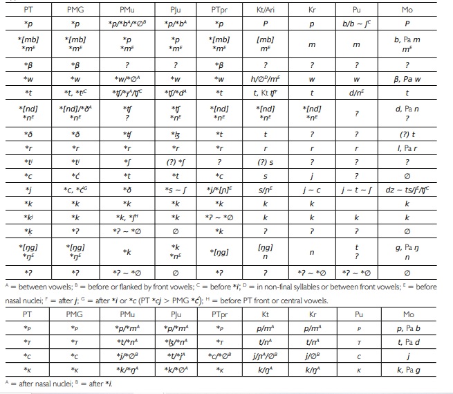 Above we have presented evidence against positing a sound change whereby PT *e would have acquired rounding (> *o) preceding labialized consonants as well as against reconstructing these labialized consonants for PT. Instead, we have proposed that the suspect correspondence should be derived from PT *ə. Moreover, in our reconstruction, PT *ə accounts for some sound correspondences deemed irregular in Rodrigues’ (2005) proposal as well as for the correspondences which underlie his reconstruction of *o. Our proposal is summarized in Table 5, where we list the reflexes of PT *ə as well of two other vowels which do not present split reflexes: PT *e and *o (in Rodrigues’, 2005, 2007 interpretation, *e and *u).