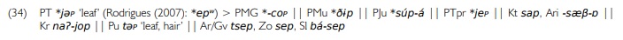 In reality, however, the Karo and Puruborá reflexes listed by Rodrigues (2005, pp. 39-40) for the correspondence sets (b) and (c) turn out to be nonexistent, and the Mondé reflexes may be equally accounted for if one accepts our reconstruction of PT *ə. Consider the following etymologies (R = Rodrigues, 2007):