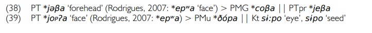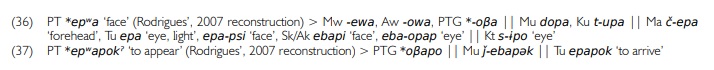 Note, however, that even within Rodrigues’ own framework the proposed etymology for ‘face’ presents serious irregularities. In his account, PT *e before a labialized consonant would be expected to yield Mw o (rather than e), Mu ə (rather than o), Ku ɨ (rather than o — note that u in the datum cited by Rodrigues (2007) is a phonetic variant of /o/), and Kt a (rather than ɨ). We surmise that in this case Rodrigues (2007) has failed to distinguish between two unrelated cognate sets, which we derive from PT *jəβa ‘forehead’ and *jopʔa ‘face’ (in addition, Mw -ewa, or sewa in our notation, appears to be unrelated to either etymon).