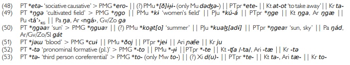 In the following examples, the reconstruction of PT *ɨ as opposed to PT *ɯ is based on non-converging evidence from only one branch, as no cognates in other diagnostic branches have been identified.