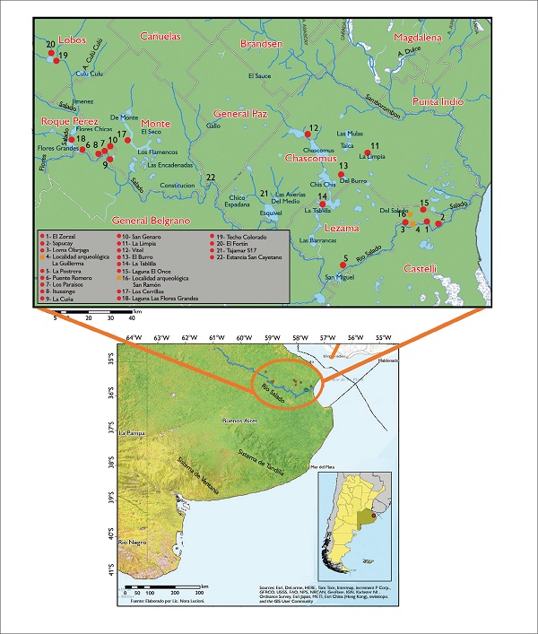 Al mismo tiempo, la ubicación de estos sitios indica que el río Salado podría ser una ruta de tránsito de los grupos humanos que ocuparon esta microrregión durante el Holoceno tardío. El paisaje habilita entradas desde el este por la bahía de Samborombón y también se encuentran, en las cercanías de los asentamientos, pasos bajos para cruzar el río en sentidos norte sur y a la inversa. No descartamos movimientos hacia el oeste. Así la ubicación de los sitios en este paisaje puede contribuir a entender situaciones de contacto e interacciones con grupos sociales de diferentes territorios (Figura 1). Por otro lado, algunos de estos sitios residenciales pudieron haber sido escenarios de agregación en momentos especiales, donde se reunirían diferentes bandas o familias de un mismo o de distintos grupos, quizás por períodos cortos, para compartir, intercambiar objetos, información, establecer alianzas o matrimonios (González & Frère, 2009; Frère, 2015).