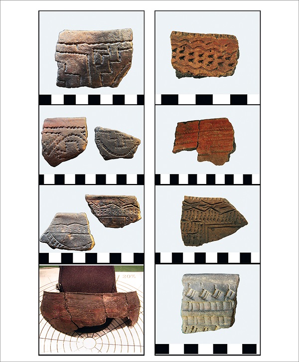 Se trata de una tradición tecnológica que perduró por lo menos durante 2000 años. Esta tradición se caracteriza por modos de hacer particulares donde los alfareros eligieron el uso de arcillas locales, decidieron sobre la necesidad de agregar tiesto molido y realizaron la quema de las piezas en fogones abiertos utilizando leña local. Las técnicas para levantar los recipientes fueron el enrollamiento y el modelado. El alisado y el pulido configuraron los acabados de superficie más elegidos. En algunos casos, también se aplicaron el engobe y la pintura roja (González, 2005; González et al., 2006; González & Frère, 2009; Frère, 2015; Frère et al., 2016c). Las decoraciones descriptas por González y Frère (2010) fueron diseños geométricos y algunos figurativos reproducidos en el tiempo, realizados mediante la técnica de impresión -puntos, banderitas, unguicular, círculos- también utilizando la incisión de línea e incisión de surco rítmico -diseños rectos, ondulados, en zig-zag, chevrons, almenados y combinaciones de estas formas (Figura 2). El conjunto cerámico aparece fragmentado, no se encontraron recipientes enteros sin embargo mediante el remontaje de los tiestos, la arqueología experimental y la reconstrucción virtual se pudieron reconocer diferentes formas y tamaños. En base a esta información se trabajó en la confección de réplicas. Estas formas proyectadas indican la elaboración de piezas que en su mayoría son globulares de tamaño mediano y pequeño (González & Frère, 2010; Francese et al., 2011; González et al., 2012; Sokol et al., 2019).
