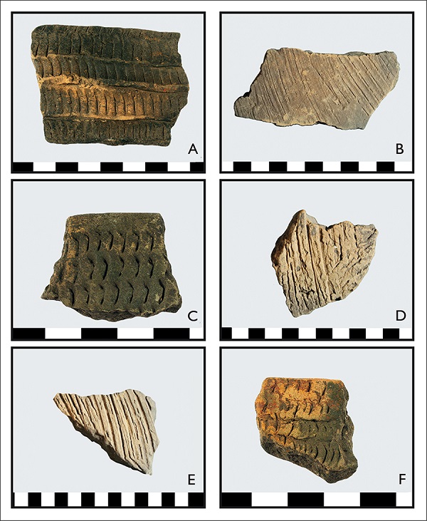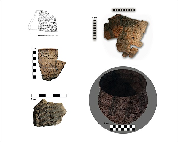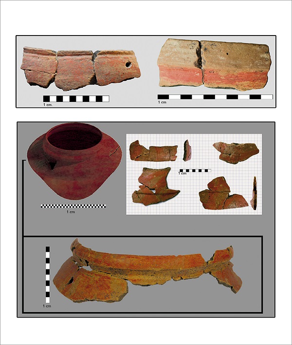 Entre los rasgos singulares que estamos considerando, se encuentran algunos tiestos cuyas formas y tamaños se distinguen del patrón descripto en el acápite anterior. Particularmente, se identificaron fragmentos de vasijas con acabados de superficie corrugado, unguiculado y cepillado, además de fragmentos con coberturas blanquecinas y un único ejemplar bicolor de fondo blanco con líneas finas pintadas en rojo. También se reconocieron formas de contornos compuestos de recipientes de tamaño grande, algunas con líneas anchas en rojo. Planteamos que estas particularidades de las formas, de los acabados de la superficie y de las decoraciones podrían relacionarse con materiales cerámicos tradicionalmente descriptos como de la tradición tecnológica guaraní.