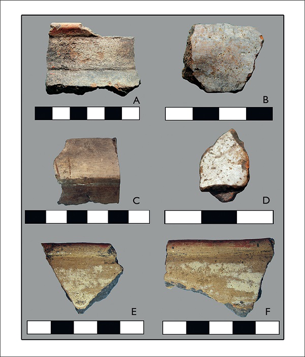 Cabe aclarar que se hicieron estudios petrográficos de ocho muestras de fragmentos de color blanquecino que se destacan por su matriz fina y sus pastas compactas con porcentajes de cavidades bajas (de 3% a 16%). Estas frecuencias son menores en relación con los del conjunto cerámico de la tradición local que tiene un contenido de poros entre 15 y 25%. En cuanto al tipo de material antiplástico que se encuentra en los tiestos blanquecinos, la mayoría es de tamaño limo y muestra una gran similitud entre sí. A su vez se diferencia del resto del conjunto de la alfarería de la microrregión del Salado por sus escasas proporciones de tiesto molido y porcentajes mayores de cuarzo, feldespatos, vidrio volcánico y hematita. Considerando las características macroscópicas particulares y la composición de sus pastas, planteamos que los recipientes con coberturas blanquecinas muestran comportamientos tecnológicos distintivos (Frère, 2015; Frère et al., 2016c).