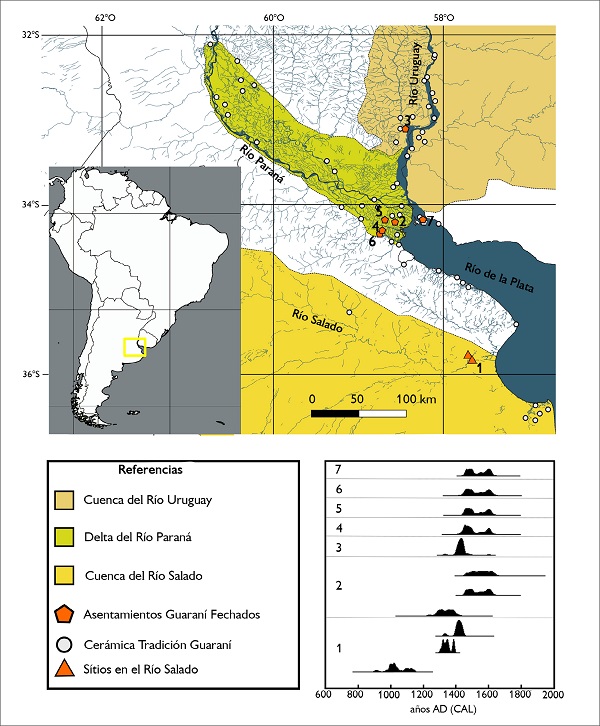 Resulta significativo integrar los aspectos tecnológicos recién mencionados con la información del momento de la dispersión de los grupos guaraníes hacia el río de la Plata. Varios autores señalaron la importancia que tuvieron los ríos Paraná, Paraguay y Uruguay en los movimientos de los grupos indígenas portadores de la tradición alfarera guaraní y en el desarrollo de extensas redes de intercambio (Brochado, 1984; Noelli, 2004; Capdepont & Bonomo, 2011; Bonomo, 2012; Costa Angrizani, 2012; Bonomo et al., 2015; Costa Angrizani et al., 2019, entre otros). En los últimos años, se ha podido establecer que la expansión meridional de los guaraníes se inicia hace 2000 años. A su vez se ubica la llegada de poblaciones guaraníes para la zona del bajo Paraná alrededor de los 1300 AD, producto del segundo pulso de expansión territorial conforme el modelo de ocupación de la Cuenca del Plata propuesto por Bonomo et al. (2015). Particularmente, el sitio arqueológico Arroyo Malo, excavado en 1925 por Lothrop, corresponde al asentamiento guaraní más consistente documentado para el área del Delta inferior del río Paraná y más cercano a nuestra área de estudio. Esta ocupación presenta una edad calibrada de 1452-1508 AD y de 1584-1619 AD (Bonomo, 2013). Finalmente, se planteó la presencia efectiva de asentamientos guaraníes en las islas de los ríos Paraná y del río de La Plata, al menos tres siglos antes de la llegada de los europeos a la región que interactuaron con los primeros asentamientos españoles (Cigliano et al., 1971; Austral, 1974; Loponte & Acosta, 2008; Loponte et al., 2011; Capdepont & Bonomo, 2011; Bonomo, 2012; Bonomo et al., 2015; Costa Angrizani et al., 2019; entre otros).