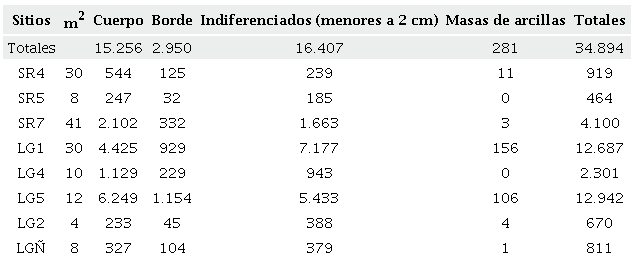 En estos sitios se manufacturó la alfarería, cuya secuencia de producción está representada en todas sus etapas. En la Tabla 1 mostramos el tamaño de las colecciones y los metros cuadrados excavados correspondientes a las localidades arqueológicas San Ramón y La Guillerma donde se han recuperado los tiestos de alfarería mencionados en este artículo.