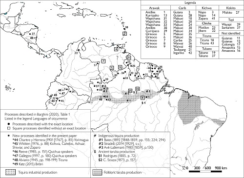 In a previous article, Barghini (2020) studied the diffusion of the process of amylolytic fermentation of complex carbohydrates to produce fermented beverages. As highlighted on that occasion, complex carbohydrates are relatively stable, making fermentation and bacterial attack harder. Thus, before alcoholic or lactic fermentation occurs, it is first necessary to perform saccharification of the starches. Traditionally, it was believed that the production of beverages from amylaceous substances in the South American lowlands took place only through the introduction of salivary amylase in the fermentation mass – in practice, through chewing. In 2004, Henkel (2004, 2005) performed a biochemical analysis of pajuaru, a beverage made by the Wapisiana indigenous group, and verified that the saccharification of starches was achieved using a mold (Rhizopus sp.) with amylolytic properties. Henkel sustained that this was the only case of this type of process in South America. Amylolytic fermentation is a process of saccharification of carbohydrates widely used in China, Japan, the Philippines, and South East Asia to produce alcoholic beverages, sauces, and food, but had not been registered in other regions of the world. However, in the previous article (Barghini, 2020), by consulting reports from missionaries, travelers, and anthropologists, it was possible to identify 43 occurrences of this type of saccharification across a large area from Guyana to the Upper Amazon, Venezuela, Colombia, and reaching Central America. The process was practiced by different linguistic groups, i.e., Arawak, Carib, Chibcha, Kichwa, Miskito, Ticuna, Tukano, Tupi, and others unidentified. The name of the fermented beverage differed according to the linguistic group, but in the Guianas and the Rio Negro, the terms parakari and pajuaru dominated. Curiously, only one of the cases compiled in Barghini (2020) referred to an indigenous group located on the right side of the Amazon River – in all of the other reports, when it was possible to locate the case, the location was clearly on the left side of the Amazon. While some reports (e.g., Peckolt, 1878) stated that the process was widespread throughout the Amazon, they often did not indicate where it actually took place. This fact appeared anomalous because the Amazon River does not represent a barrier to cultural diffusion, and there are no substantial differences between the two sides of the river from a biogeographical point of view.