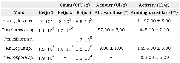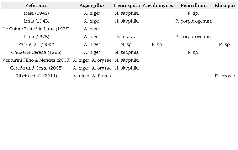 For a correct interpretation of the data, it is crucial to add the table of Park et al. (1982), reproduced from Cereda and Brito (2018), which shows the distribution of the molds in three samples, and distinguishes the activity of alpha-amylase and amyloglucosidase (Table 2).