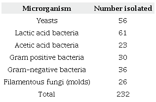 Sousa (2012) also identified only yeasts. Pichia kudriavzevii, Pichia exigua, and Pichia membranifaciens were the predominant species during the fermentation process of the drink. However, 232 microorganisms were identified in total, including filamentous fungi, which were not better identified, and were distributed according to Table 3.