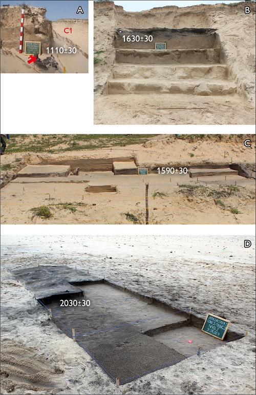 Squared-pit 2 in the northern part of C1 covered about 3 m2 intercepting the wall of the stratigraphy made by the Aeolian erosion. Its excavation removed about 2.5 m of sterile sediments until it reached the top of the L03, the paleosol located between the D2 and D3 dune generations (Figure 2). The L03 had a thickness of about 30 cm and its excavation consisted of the removal of several artificial levels, 5 cm thick. The L03 layer revealed eight small cortical flakes and six tiny non-cortical flakes, the results of retouching processes and edge sharpening, as well as a tool on a support-flake and a debris. A priori, this small assemblage seems to indicate that tool finalization took place in this portion of the site. This assemblage is associated with a shell dated to 1487-1285 Cal BP (1630 ± 30 BP - Beta 504659).